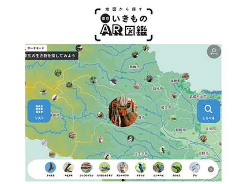 本展示では、東京の自然フィールドを8K撮影映像で紹介しながら、手元の小型モニターで参加者が好きなところを自由に拡大し、生きものを発見・観察することが出来る「東京ネイチャースコープ」や、東京に生息する生きものを、巨大地図から専用タブレットを使ってARで探すアプリ「東京いきものAR図鑑」など、大人から子供まで楽しめるものです。展示を楽しんだら、次はぜひ、実際のフィールドにも足を運んでみてください。
